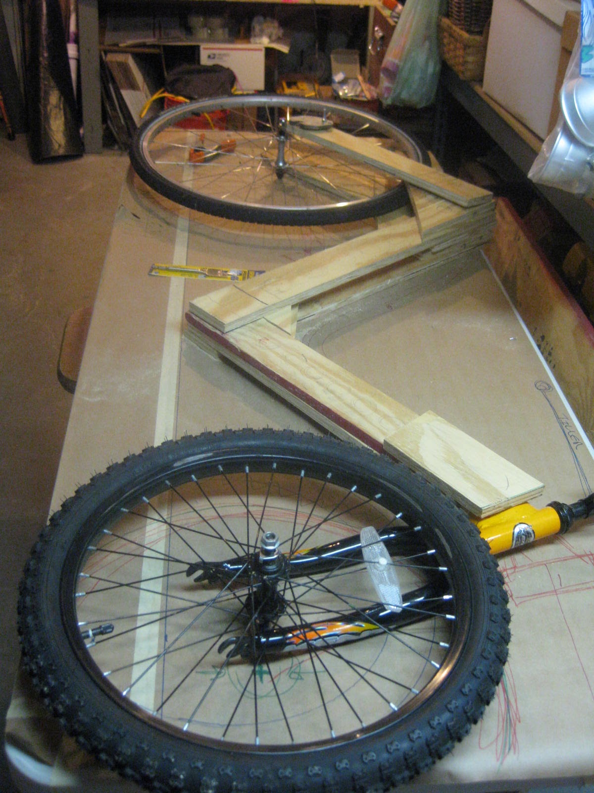 I set of goal for myself to spend as little as possible and mainly use spare parts in my bike and "old project" arsenal to make a fared low-racer suitable to use as an errand bike. From my wooden boat building past I have 3/4 inch marine plywood, this will be the frame. The rear wheel is a 700c from an old station bike/beater I no longer use. The rear drop-outs are electric junction box covers that have been drilled and cut. The front wheel, head tube, bottom bracket and fork are from a kid's BMX, and the FWD drive train will be built from the station/beater bike parts. The frame is cut. I will be spending the next weeks assembling the frame.